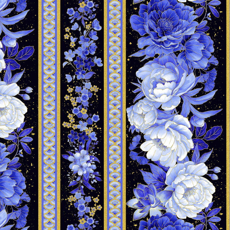This exquisite fabric features a striking design of large, vibrant blue and white peonies set against a deep black background. The floral pattern is accentuated by elegant gold and blue stripes that run vertically, adding a touch of sophistication and contrast. The intricate detailing of the flowers, combined with the luxurious color palette, makes this fabric ideal for creating standout garments or home decor items that demand attention and admiration.