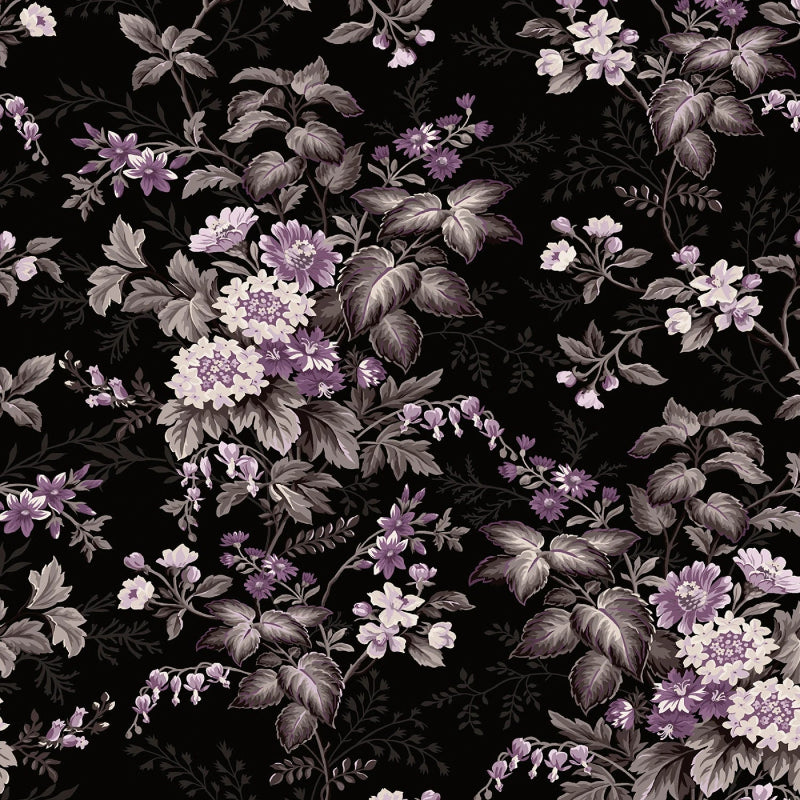 This fabric showcases a large floral pattern with intricate details, featuring a variety of flowers in shades of white, purple, and grey against a deep black background. The design is elegant and sophisticated, suitable for creating high-end garments, home decor, or crafting projects that require a touch of classic beauty. The floral motifs are well-spaced, allowing for versatile cutting and sewing options.