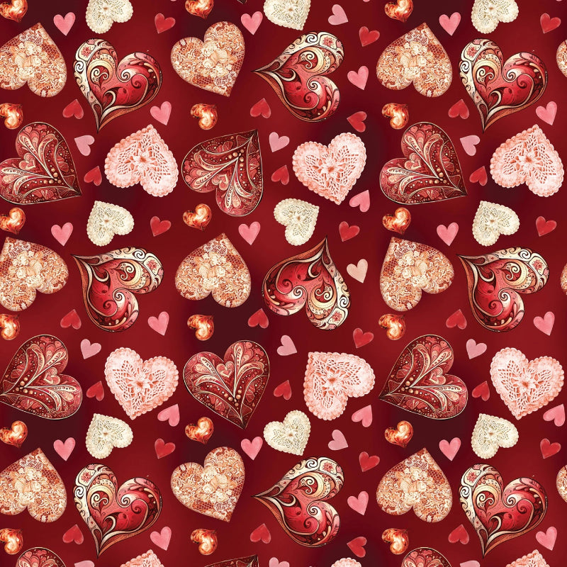 Red Velvet Romantic Hearts # 15107B-10 From Benartex - Contempo - Kanvas Cupid's Arrow by Nicole DeCamp Collection This enchanting fabric features a rich red background adorned with an array of romantic hearts in various shades of red, pink, and white. The hearts are intricately designed with patterns that include lace-like textures, floral motifs, and swirling designs, creating a visually captivating and romantic theme perfect for crafting projects that evoke love and affection. The fabric's vibrant colors and detailed heart patterns make it ideal for Valentine's Day projects, romantic home decor, or special occasion garments.