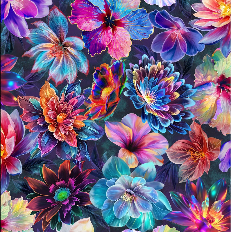 This vibrant fabric features a stunning array of digitally printed flowers in a kaleidoscope of colors, from deep purples and blues to bright pinks and oranges, set against a dark navy background. The floral design is intricate and modern, with each bloom appearing to glow with a luminous quality, creating a captivating visual effect. Ideal for a variety of projects, from fashion to home decor, this fabric's rich color palette and detailed design ensure it will stand out in any application.