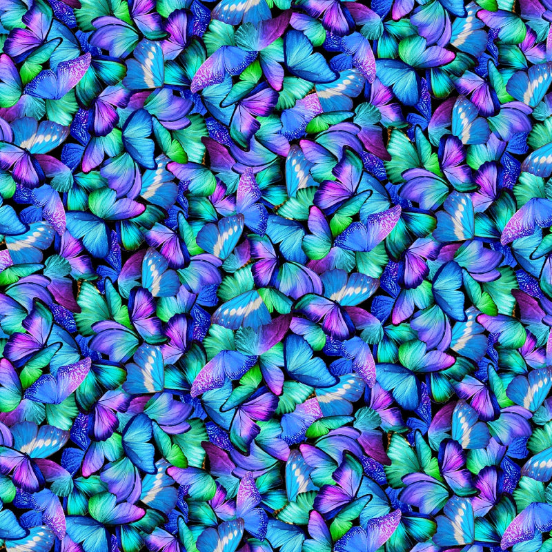 This vibrant fabric features a mesmerizing array of butterfly wings in shades of blue, purple, and green, creating a dynamic and lively pattern that is perfect for adding a touch of nature's beauty to any project. The design showcases an intricate mix of colors and textures, giving the illusion of countless butterflies in flight, making it an eye-catching choice for both fashion and home decor.