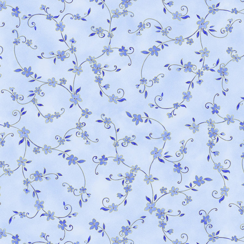This fabric features a delicate design of metallic leaves and vines in various shades of blue, set against a light blue background. The pattern is intricate and elegant, providing a subtle yet sophisticated look that is perfect for a variety of crafting and sewing projects. The fabric's lightweight and breathable nature makes it ideal for garments, quilting, and home decor items, ensuring both comfort and style.