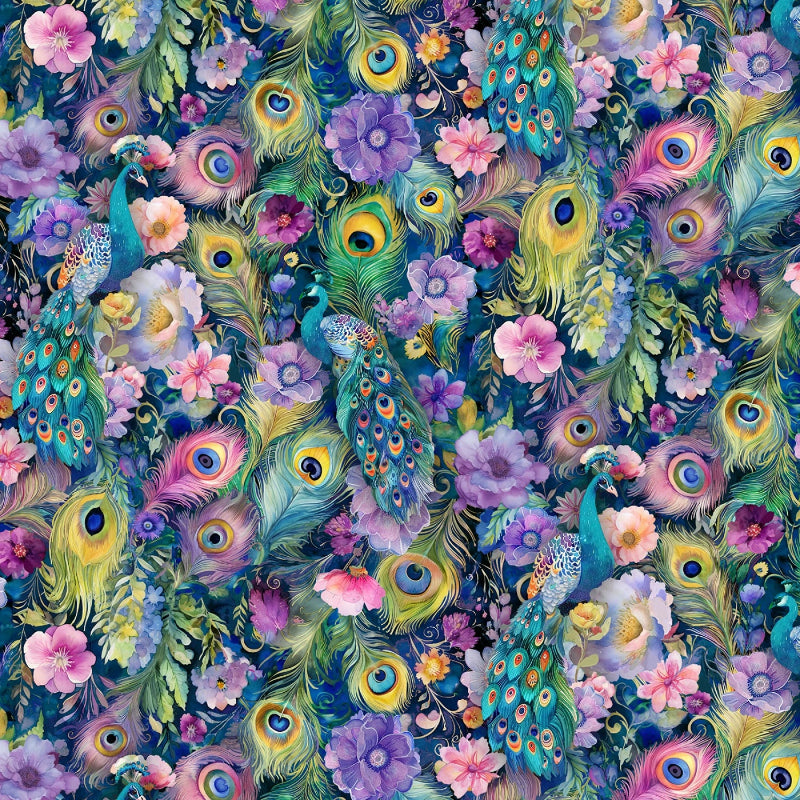 This vibrant fabric features an enchanting design of peacock feathers interwoven with a variety of colorful flowers, creating a lush, garden-like scene. The intricate pattern showcases the iridescent blues, greens, and yellows of peacock feathers alongside soft pinks, purples, and yellows of floral blooms, making it a perfect choice for projects that require a touch of whimsy and elegance.