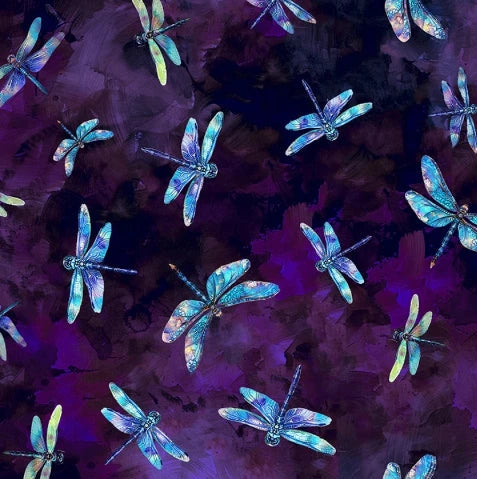 This enchanting fabric features a mesmerizing pattern of vibrant dragonflies in shades of blue and purple, set against a deep, dark backdrop with hints of lighter purple and blue. The dragonflies appear to be in flight, creating a dynamic and lively design that captures the essence of nature's beauty. Ideal for a variety of projects, this fabric's vivid colors and intricate design make it perfect for creating standout garments, quilts, or home decor items.