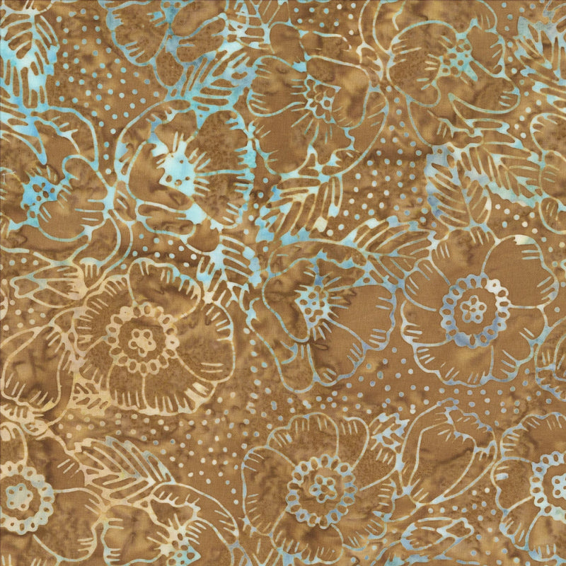 Coast Gardenias Batik # 2788Q-X From Anthology Fabrics Sway Baliscapes by Anthology Collection This exquisite fabric features a captivating batik design with large, detailed gardenia flowers in shades of blue and brown, set against a warm, earthy background. The intricate floral pattern is highlighted with delicate white outlines, creating a stunning contrast that brings the gardenia motifs to life. Ideal for a variety of sewing projects, from elegant garments to sophisticated home decor, this fabric combines traditional artistry with modern appeal.